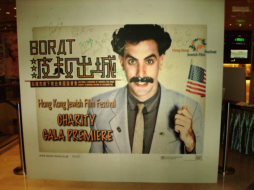 But the advance word on BORAT was that it would be a fairly safe bet to make. So I contacted the local distributor and asked if I could have the HK premiere as a fundraiser for the Hong Kong Jewish Film Festival. She thought I was crazy. She had seen the film and she told me that Borat was an anti-Semite. She didn’t use the word “anti-Semite” (she didn’t know the word in English) but she knew that Borat didn’t like Jews. I smiled and said that I knew. “That’s why I want to show it”, I told her. “The film is satirical.” (The concept of satire is mostly lost on the Chinese.) She shrugged and let me have it.