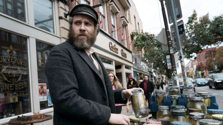 Seven years after Rich’s novella was published, AN AMERICAN PICKLE has emerged and stars Seth Rogen (THE LION KING; THE DISASTER ARTIST; STEVE JOBS; THE INTERVIEW), who plays not just Herschel (now surnamed) Greenbaum but his great-grandson Ben Greenbaum as well. Here, Ben is a software developer hoping to sell his socially conscious crowd-sourcing app for big bucks when Herschel arrives on the scene. Arguably even more of a complete schmuck than the fictional Simon, Ben repeatedly sabotages Herschel’s up-and-coming success as a hipster pickle entrepreneur.