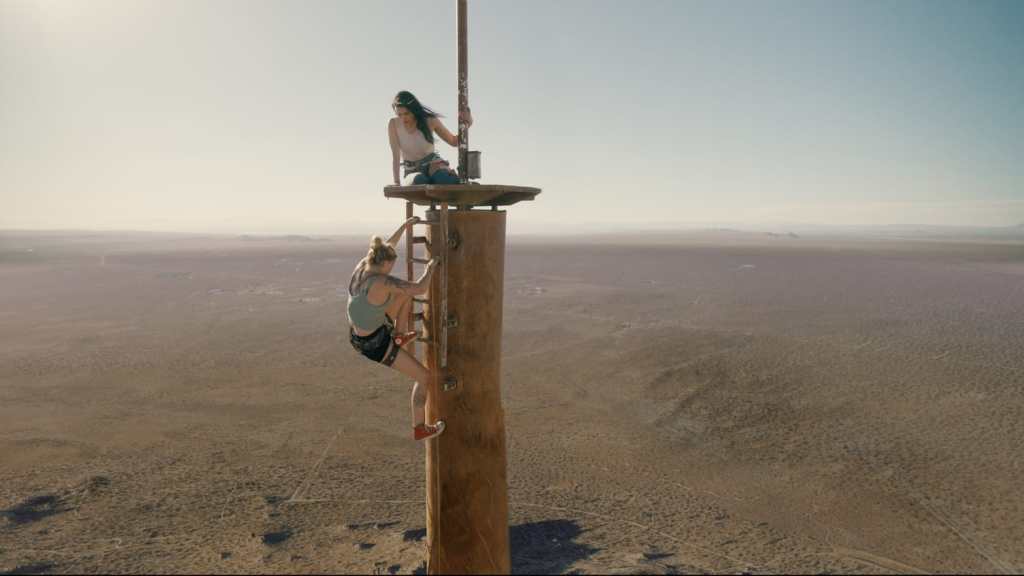 Becky Connor (Grace Caroline Currey, SHAZAM!; ANNABELLE: CREATION) and her husband, Dan (Mason Gooding, BOOKSMART; TV’s LOVE, VICTOR) are avid rock climbers. On one of their ascents with Becky’s best friend, Hunter (Virginia Gardner, HALLOWEEN), tragedy strikes, leaving Becky a heartbroken mess. She turns to the booze and pills to manage her grief, much to the frustration of her father, James (Jeffrey Dean Morgan, HEIST; TV’s THE WALKING DEAD). One week before the first anniversary of that event, Hunter, who has since gone on to become a social media sensation with her extreme stunts, megawatt smile and ample cleavage, returns and convinces Becky to get back on that horse, so to speak, and join her in climbing B67, an abandoned TV tower located in the Mojave Desert that’s twice as tall as the Eiffel Tower. Becky agrees and the two of them set off together. What could possibly go wrong with climbing a rusty tower in the middle of nowhere? For starters, the ladder that takes them up to the breakfast table-sized platform breaks away from the main structure, leaving the women with no safe way to get down. With the sun beating down on them, no water, injuries, circling vultures, and no mobile phone signal at that height, the pair must pull out all the stops in order to stay alive until someone comes to rescue them.